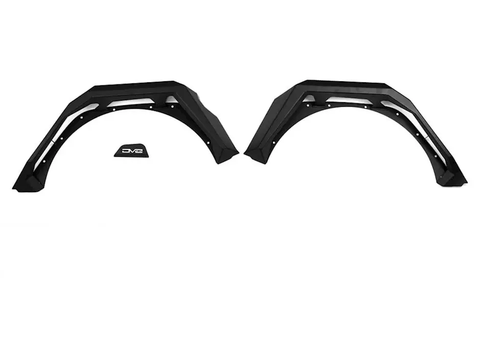 Our fender flares feature a rigid armor-plated design and a narrow width. The fenders come with paintable aluminum accent panels and bolt-on paintable fender vent logo plates. Each of the front fenders include plug-n-play LED button style amber turn signals. The fenders rubber seal prevents build-up in between the flares and the vehicle body. The fenders bolt-on using nutserts. They are made from steel, and are finished in a micro-texture black powder coat.* Please Note: Trimming on the front fender mount is required for installation of the fenders.