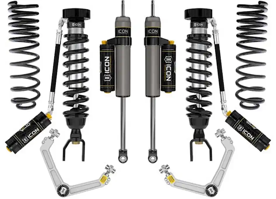 ICON Vehicle Dynamics 2019-2023 Ram 1500 suspension systems are designed with maximum performance and the serious driver in mind. ICON engineers primary focus is to increase wheel travel and damping ability, which translates into outstanding vehicle control and ride quality both on and off-road. This Stage 4 system includes vehicle-specific tuned 2.5 coilover shocks featuring CDCV equipped remote reservoirs for exceptional cooling properties and ICON-engineered coil springs for superior vehicle feel through the range of travel. These coilovers, are also height adjustable for 2-3 of front lift over stock, allowing the use of larger, more aggressive wheel and tire combinations and their longer than stock length improves performance by increasing front wheel travel. Billet aluminum Delta Joint upper control arms not only add strength and durability but help retain factory alignment specs, offer on-vehicle caster/camber adjustment, and allow proper wheel alignment at the lift height this system provides. The dual-rate rear coil design provides a softer ride height spring rate with a firmer overload rate that combine to deliver on-road comfort with excellent bottoming resistance and superior off-road performance. 1.5 of rear lift height over stock allows a for level stance front to rear. ICON 2.5 Aluminum Series CDCV piggyback reservoir rear shocks utilize a vehicle-specific valving that balances the performance of the truck from front to rear. The included ICON CDC Valves are externally adjustable valves that restrict oil flow into the reservoir which creates 10 levels of compression damping force ranges. The ICON Vehicle Dynamics 2019-2023 Ram 1500 Stage 4 suspension system is an excellent choice for those drivers looking to enhance the capabilities of their pickup on the road as well as in the dirt.